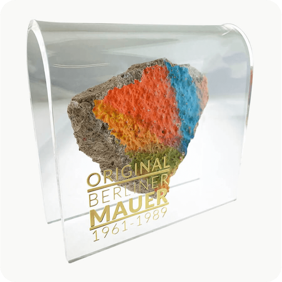 Pierres authentiques de la chute du mur de Berlin directement de la manufacture berlinoise avec certificat d’authenticité.